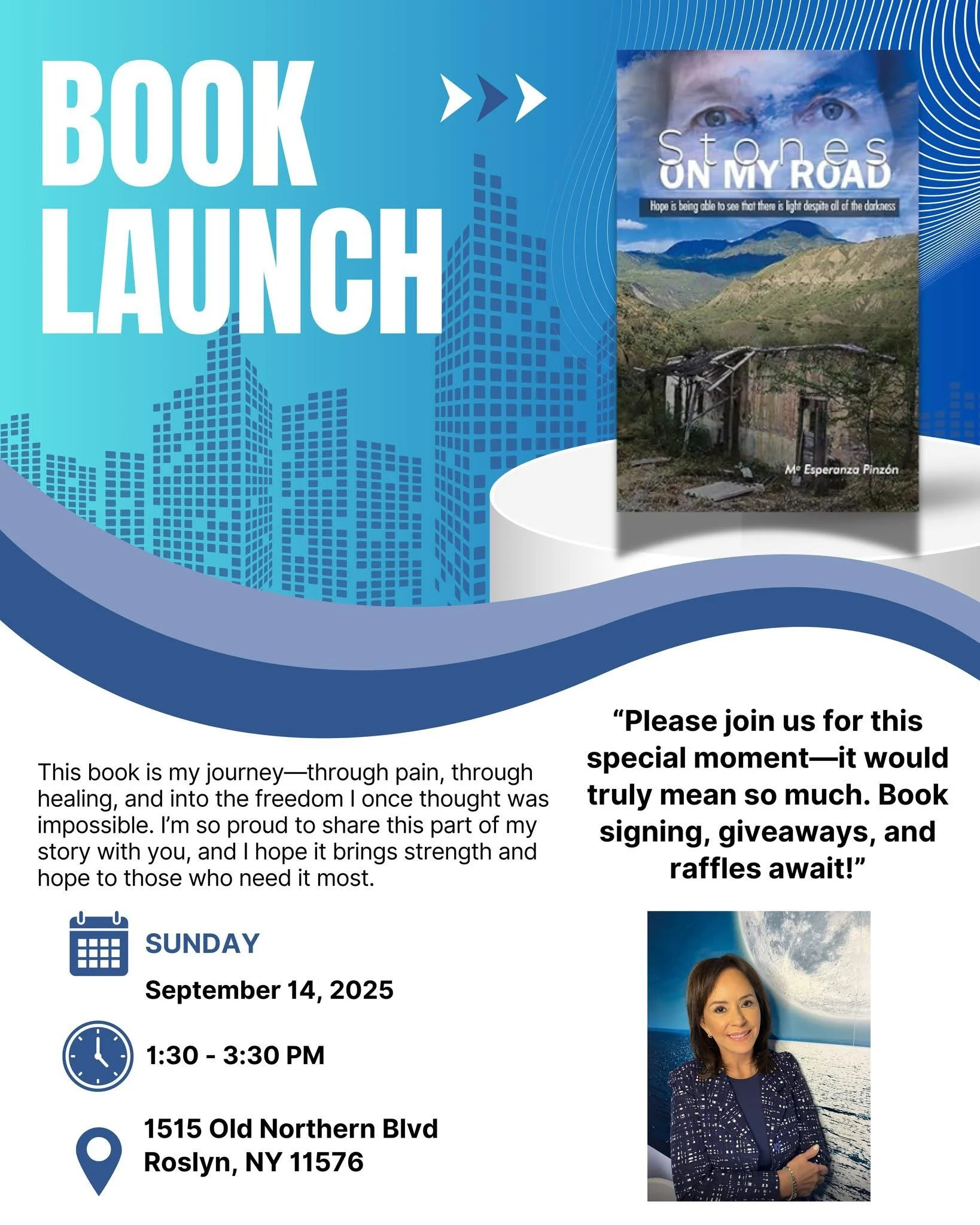 Esperanza means hope—and with great joy, I invite you to the launch of my book Stones on My Road. This book is a piece of my journey, and I would be honored to share this special moment with you.